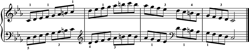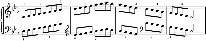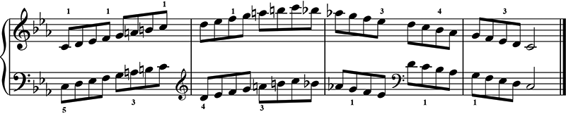 Minor scales are presented in the natural, harmonic, and melodic forms. Practice one scale for each form, but each tonal center must be different.