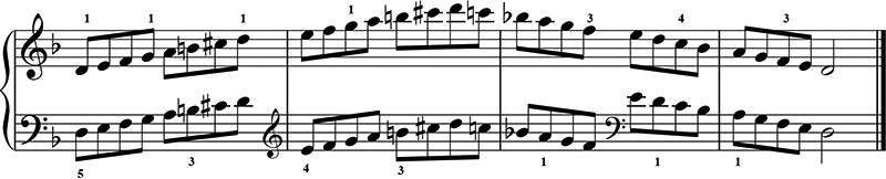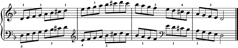 Minor scales are presented in the natural, harmonic, and melodic forms. Practice one scale for each form, but each tonal center must be different.